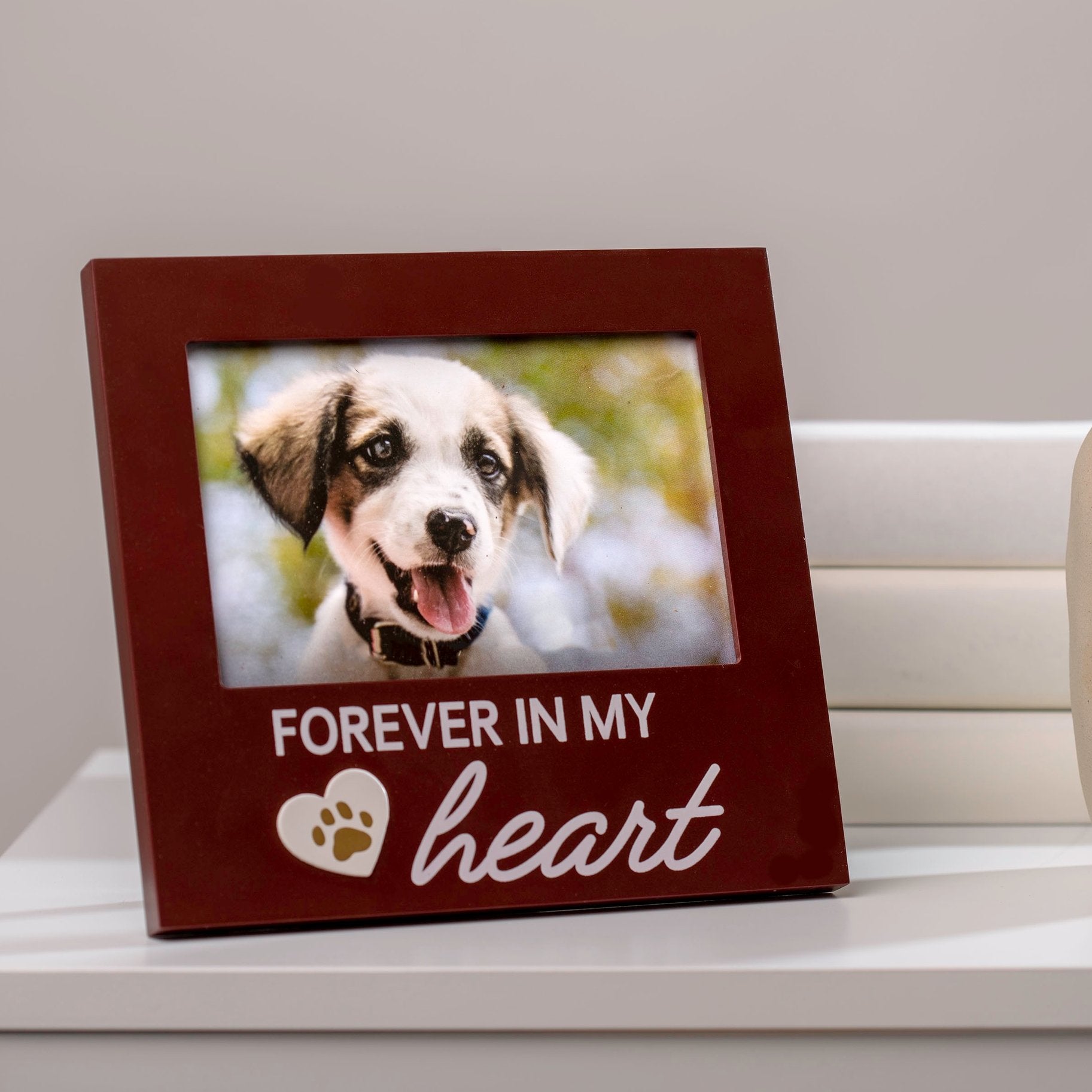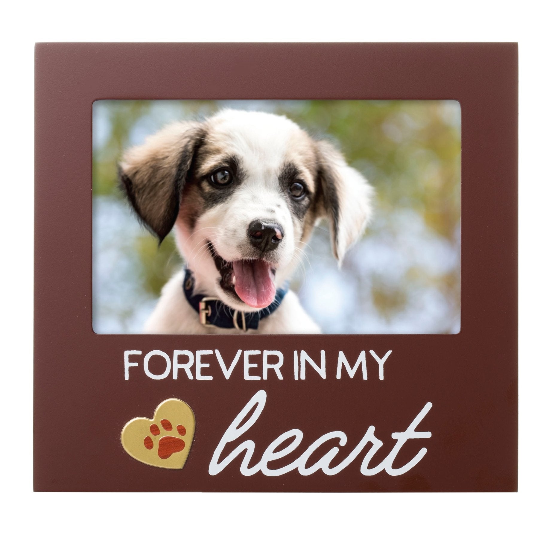 While your dog may be gone, their memory will forever live on with this Forever in My Heart Dog Memorial Frame. "Forever in My Heart" is written in white and includes a gold heart and pawprint embellishment. This espresso, wooden frame is the perfect way to remember your furry friend. The frame includes a triangle hanger so you can add it to any wall or simply place the frame on a tabletop or desk with the included easel.