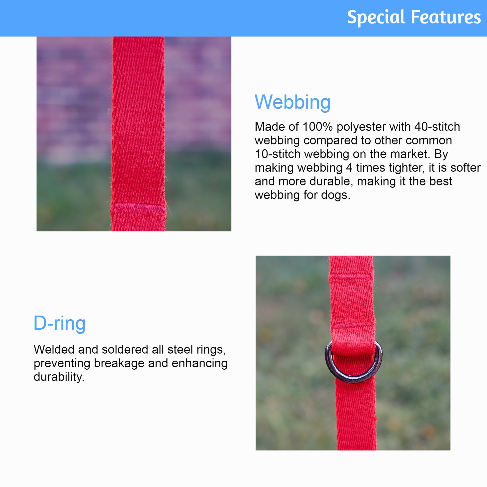 Webbing - Made of 100% polyester with 40-stitch webbing compared to other common 10-stitch webbing on the market. By making webbing 4 times tighter, it is softer and more durable, making it the best webbing for dogs.
